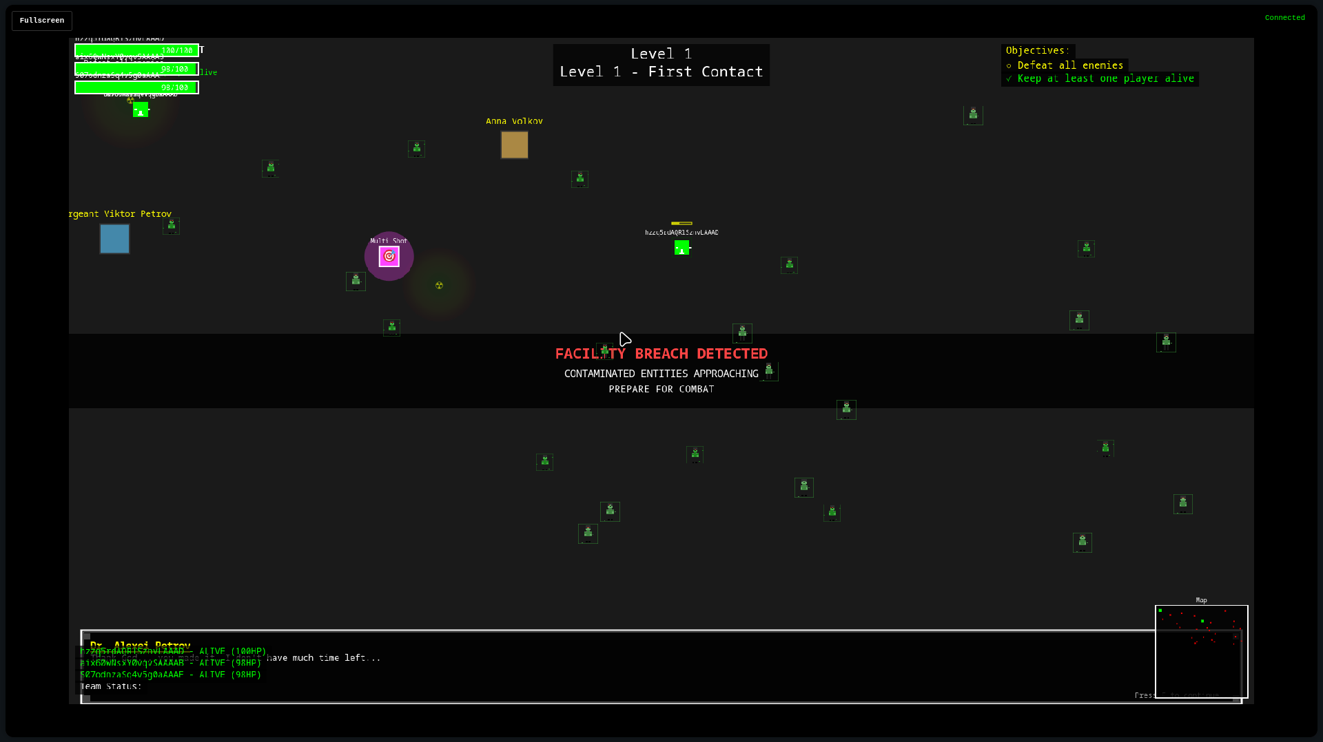 A browser-based multiplayer top-down 2D game for exactly 3 players. Set in a post-nuclear disaster scenario, players must work together through 6 levels where they progressively sacrifice team members to save humanity by shutting down a nuclear reactor.
